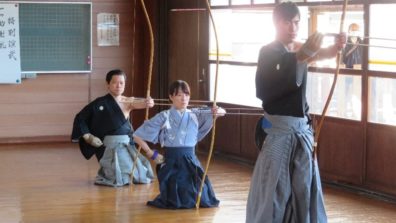 弓道、合気道、空手、柔道、剣道の皆さんが集まり武道館開きが行われました。 各部が新年の抱負を発表をし、弓道部により特別演武披露が行われました。 ●武道館開きの様子
