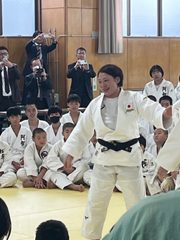 令和8年度の競技力向上事業である柔道教室が令和7年11月23日(日)に飯田市武道館で行われました。講師に北京、アテネ五輪で連続オール1本勝ち金メダルを獲得した柔道家の谷本歩実さんをお招きし、広く南信地区の少年少女144名の選手が集まりました。