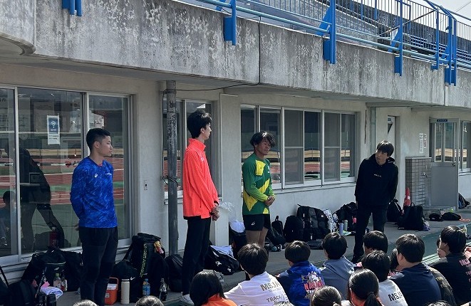 今回は2024年パリオリンピック走高跳日本代表の赤松諒一さん、2023年ブダペスト世界陸上男子三段跳び日本代表の池畠旭佳瑠さんと地元飯田出身の尾畑元佳の3名を講師としてお迎えして小学生から高校生までの約85人が参加して行われました。